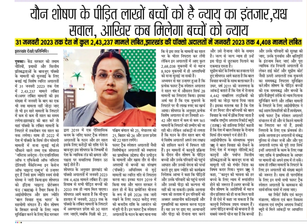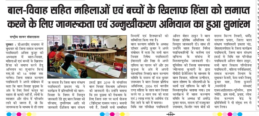 5. 16 October 2023 - Child Marriage Free India Campaign Event – The campaign event was conducted in Dumka district covering225villages in collaboration of District education department, District Panchayati Raj, District Child Protect Unit, JSLPS and District Health Department with notifications issued by Deputy Commissioner and District Social Welfare department. The campaign was organized in Dumka districts, 225 villages with 1490 women leaders and adolescent girls an outreach of 72000.