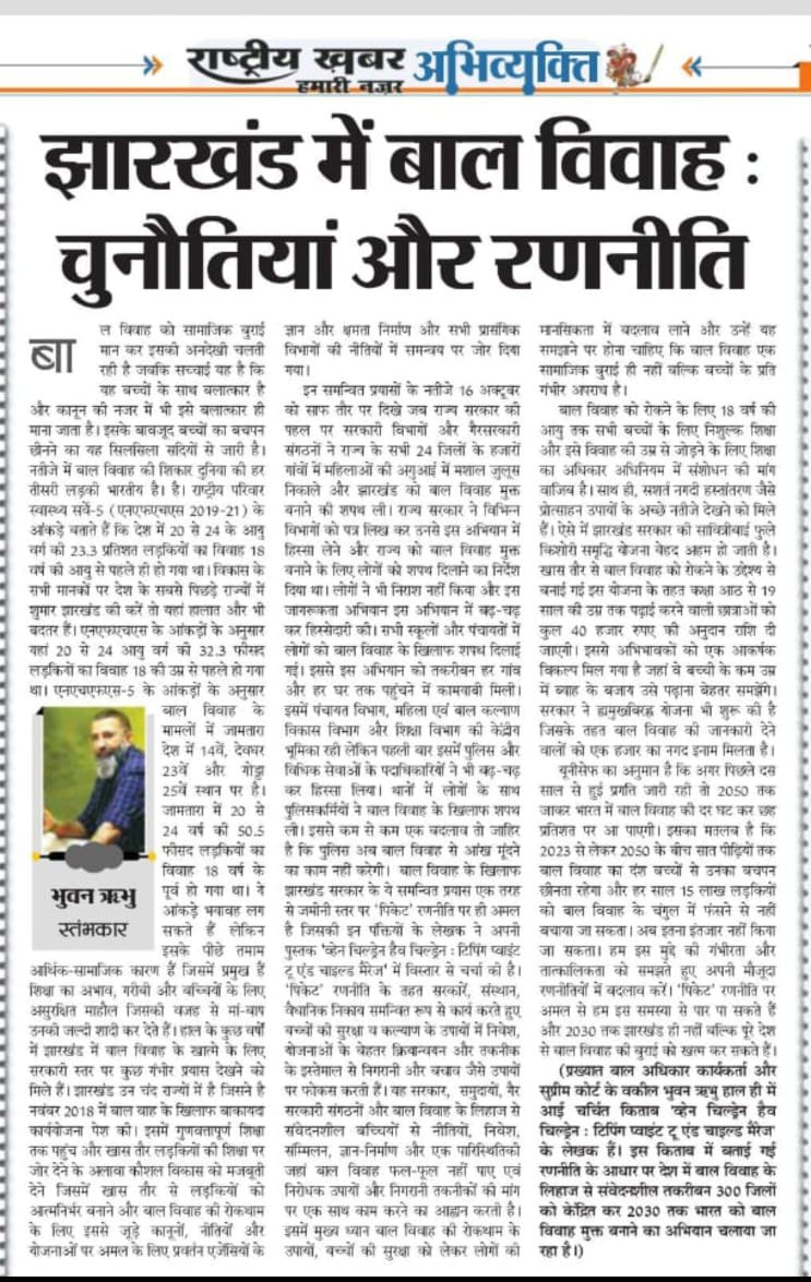 Noted child rights activist, author, Supreme Court lawyer and founder of CMFI campaign, BhuwanRibhu has authored a book - ‘When Children Have Children: Tipping Point to End Child Marriage’ and put forth a framework advocating a sustainable, holistic and focused strategy with time-bound targets and measurable indicators to make India child marriage free by 2030. This book shows the path to eliminating child marriage in India within the next decade. As suggested by the author in the book, by adopting a systematic, highly focused, and intensive intervention model, over a phased timeline it is possible to reduce the national child marriage prevalence levels to 5.5% —the threshold, the tipping point, beyond which the prevalence is anticipated to diminish organically with reduced reliance on targeted interventions.