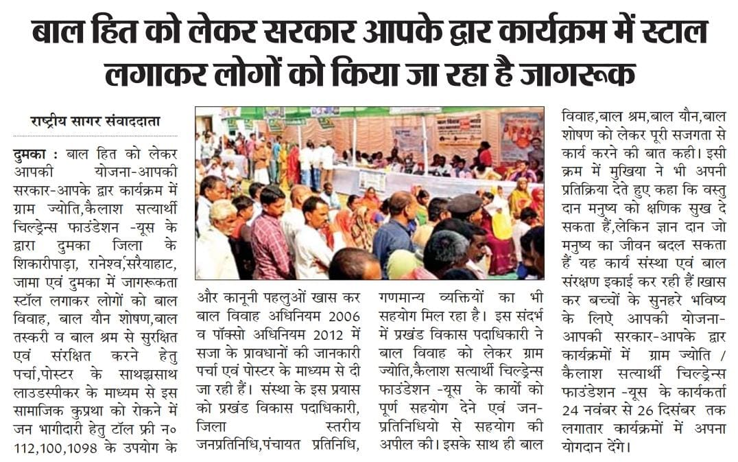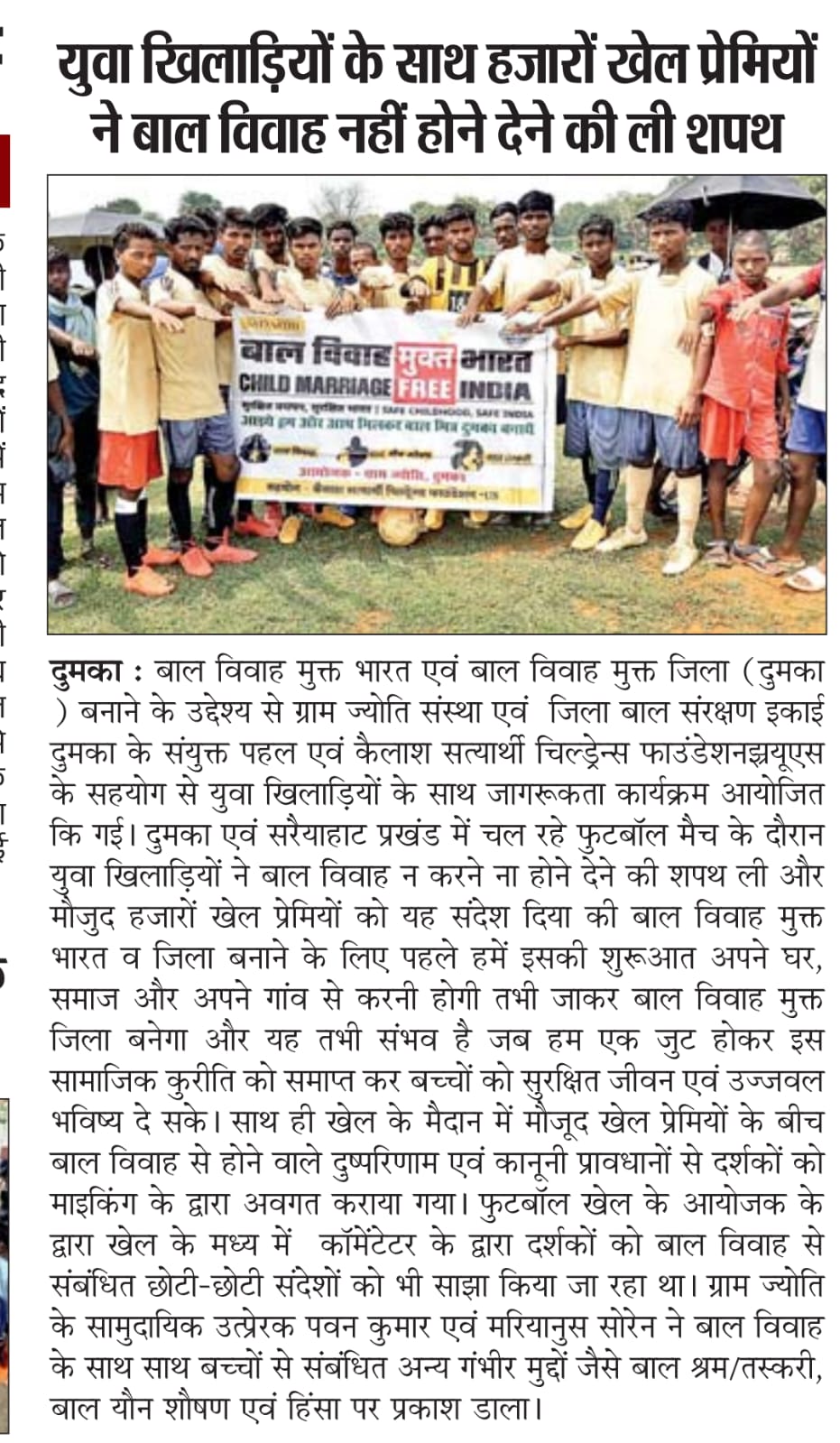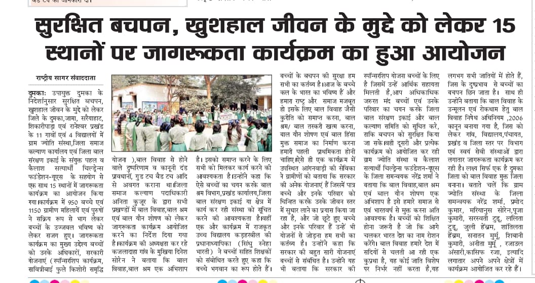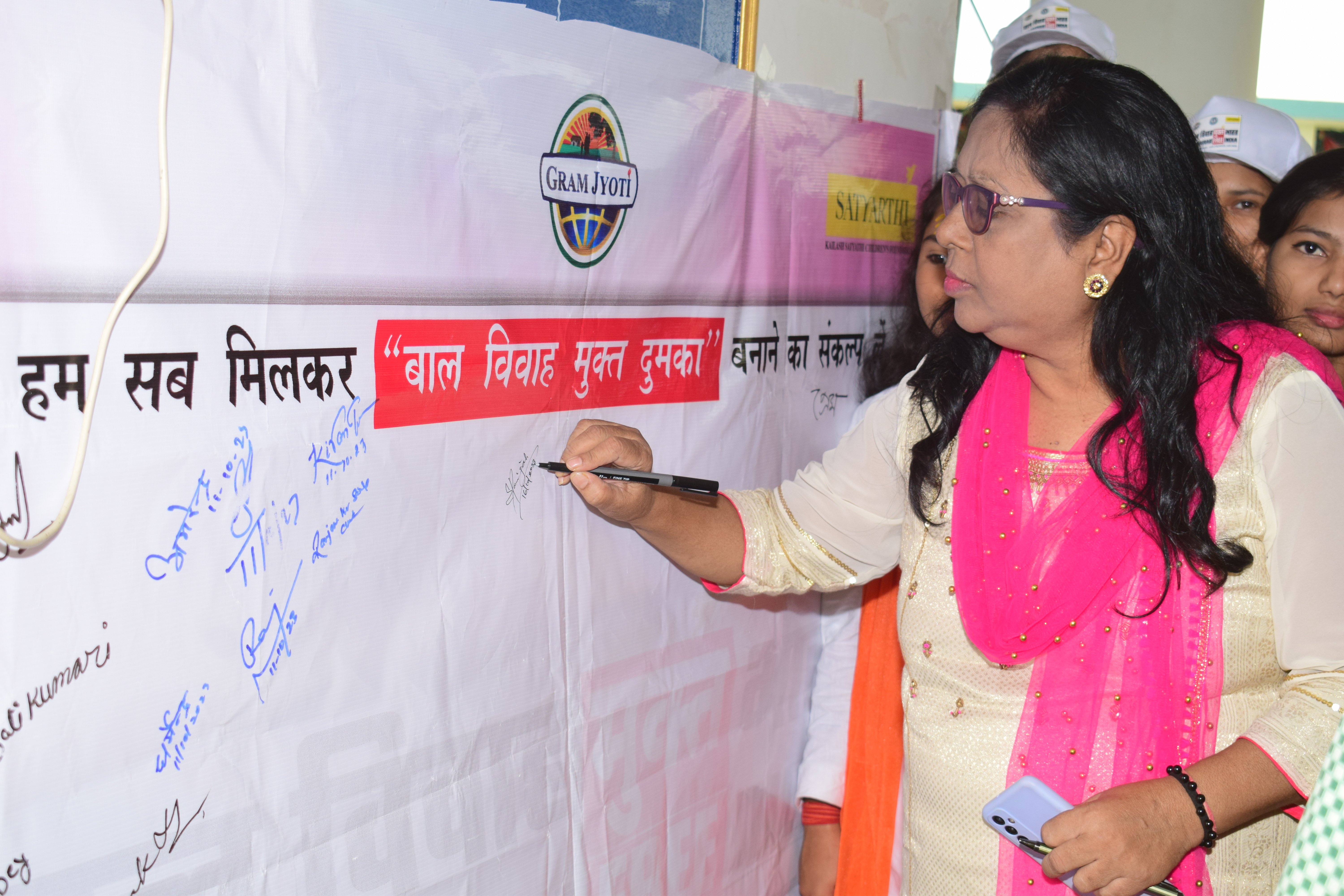 GRAM JYOTI (GJ) is committed to addressing issues pertaining to the development and protection of women and children, health and nutrition, education, and the rights and advancement of the rights of various vulnerable social groups in 150 villages of Dumka district in Jharkhand state. The organization is working on the following issue of Child Marriage, Child Trafficking, Child Labour and Child Sexual Abuse. The organization participated and organized Child Marriage Free India Campaign in Dumka districts of Jharkhand covering over 150 villages under the project.