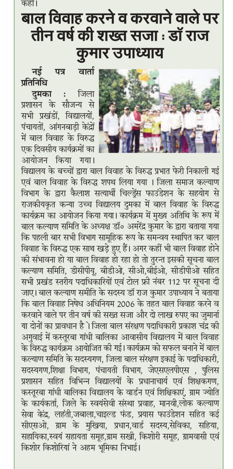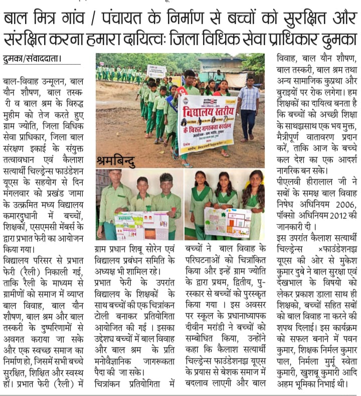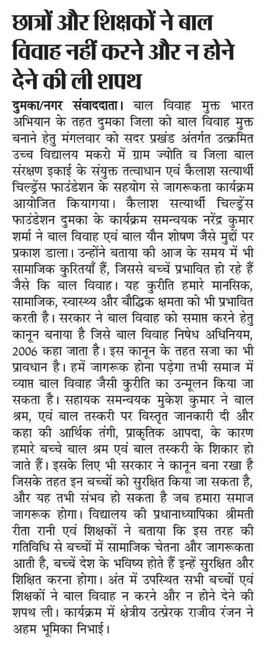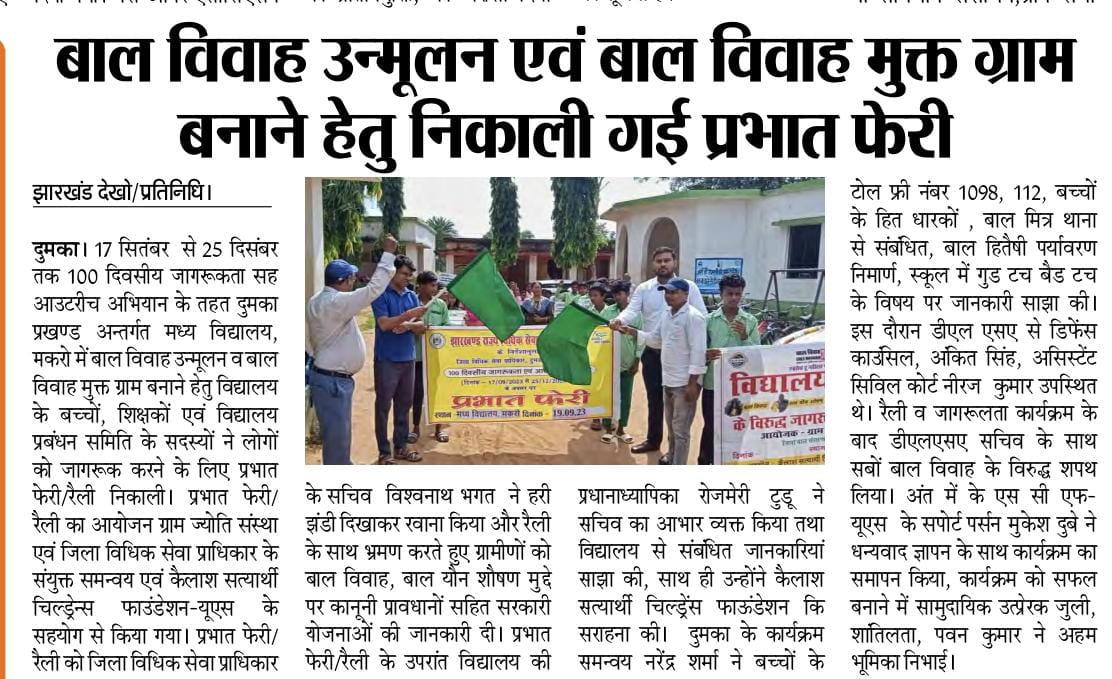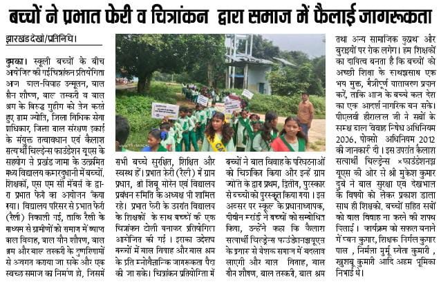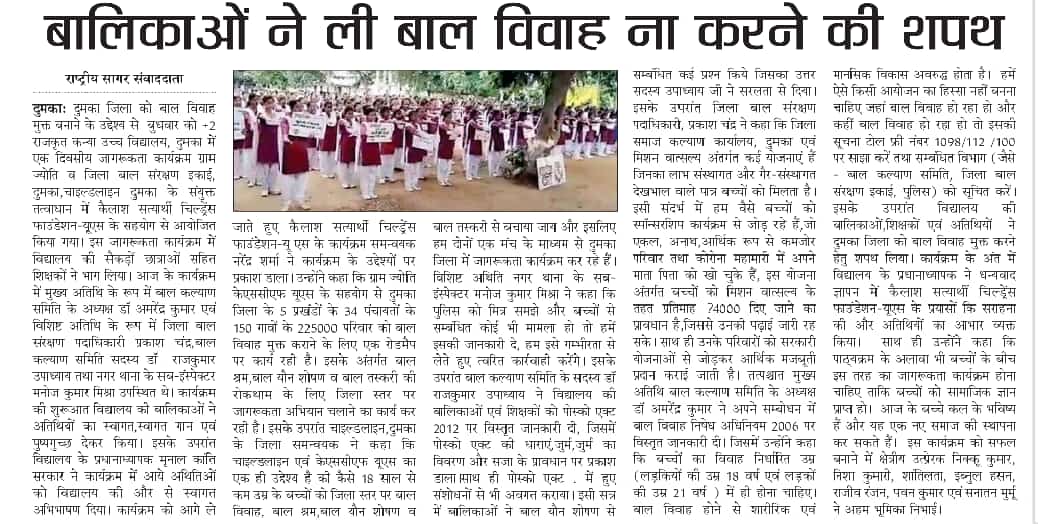 3. 100 days awareness campaign - The 100 days of campaign was organized by GRAM JYOTI with the close direction of DLSA, Dumka. GJ conducted regularly awareness programs on “Child Marriage Free Dumka” in the schools and community. Prabhat Pheri, Quiz/Painting competitions are also organized in the 54 schools with covering of 6500 children.