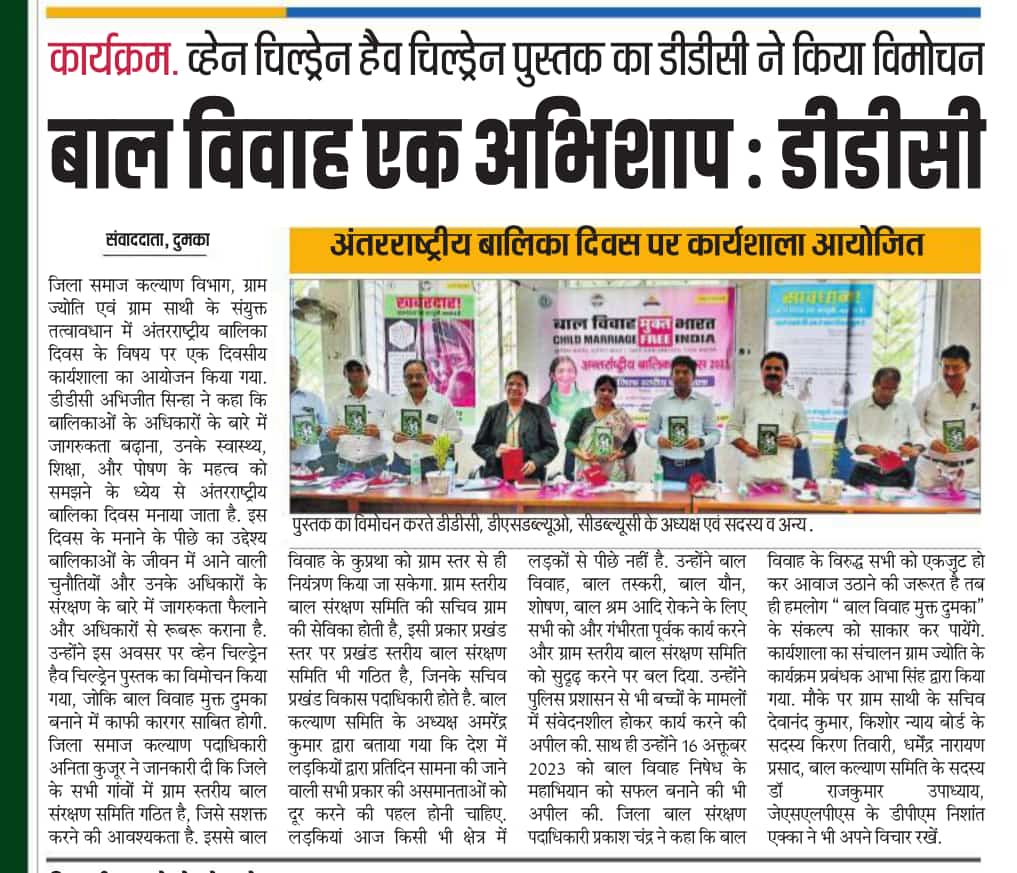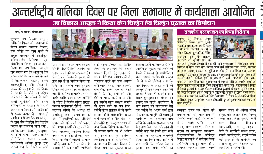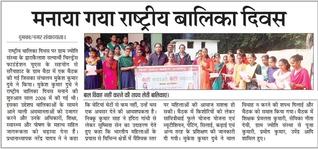 4. Celebrating International Girls Child Day – The district level event has been conducted by the GJ with the collaboration of District Administration and Social Welfare Office, Dumka. The Social Welfare Office, Dumka issued a notification regarding conducting the event by Gram Jyoti. During the event Govt. officials launch the book “When Children Have Children” Author Shri BhuwanRibhu.